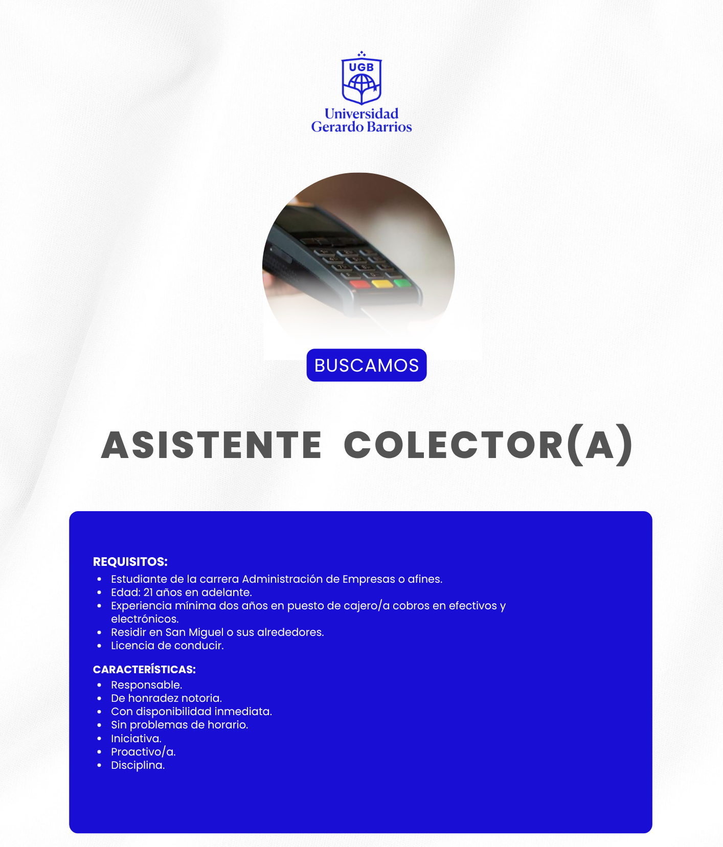 Interesados enviar su hoja de vida reciente con fotografía al email: contrataciones@ugb.edu.sv