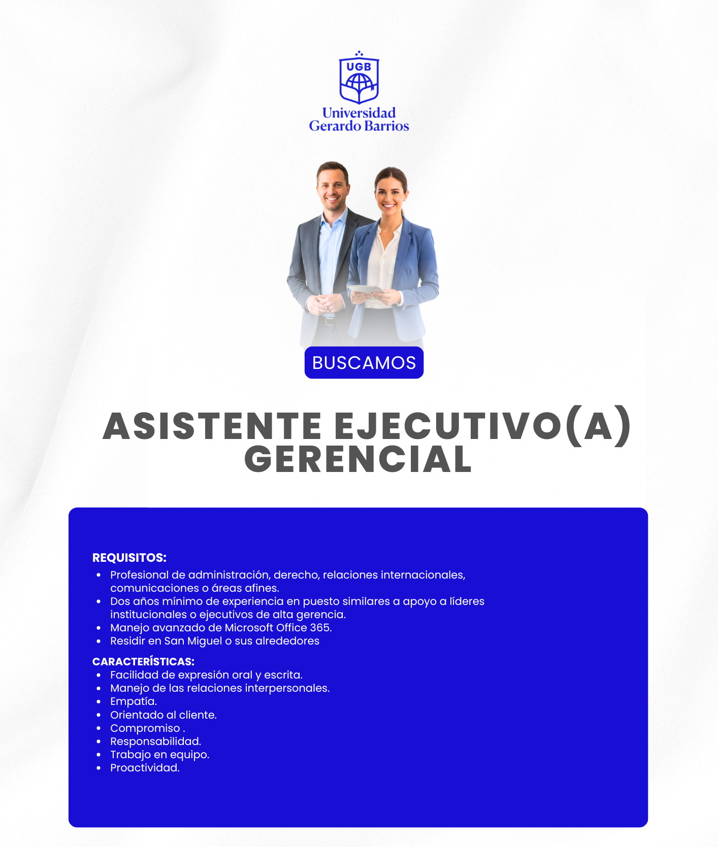 Interesados enviar su hoja de vida reciente con fotografía al email: contrataciones@ugb.edu.sv