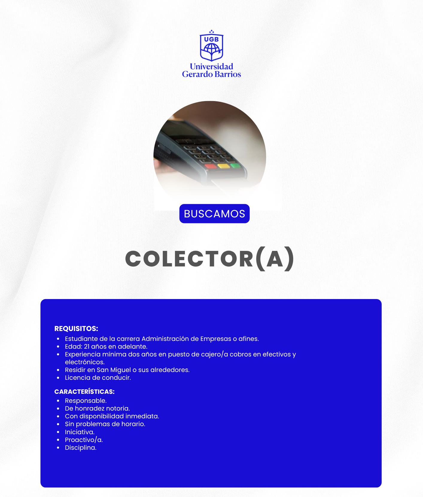 Interesados enviar su hoja de vida reciente con fotografía al email: contrataciones@ugb.edu.sv